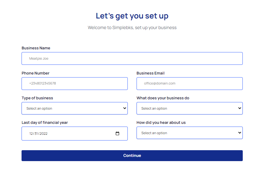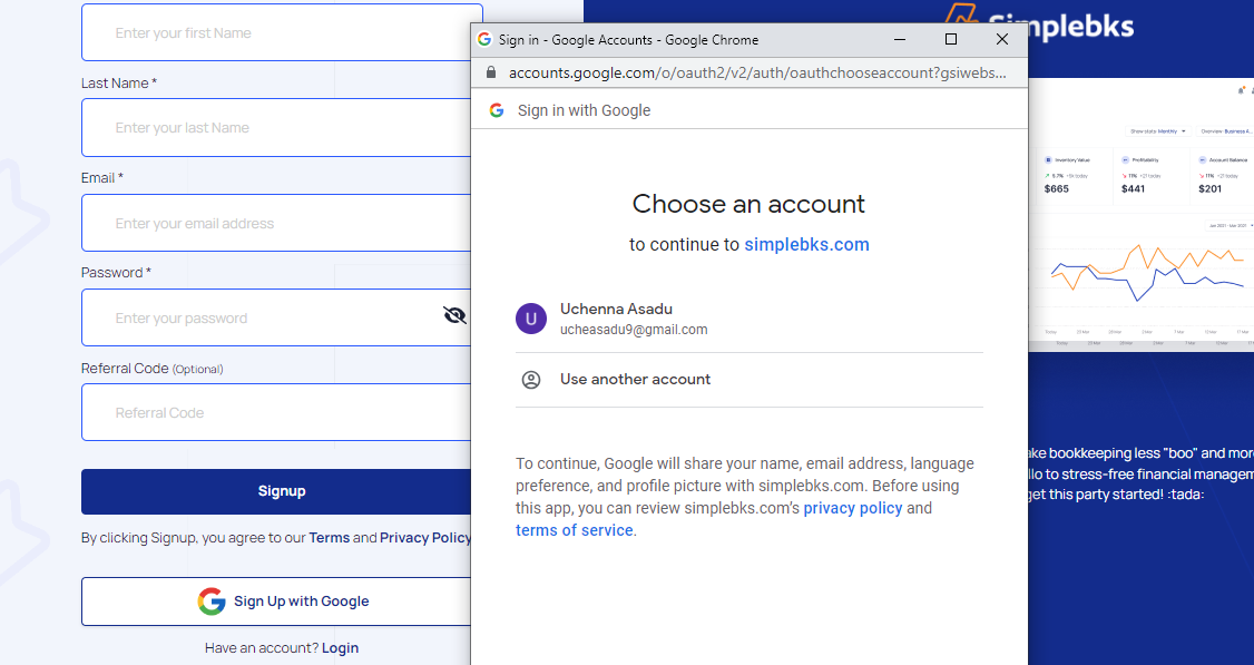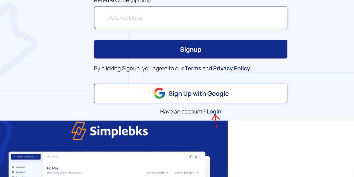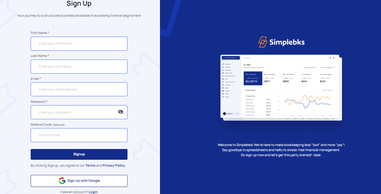 Creating a Simplebks account is free, easy, and can be done in a few minutes. First, by providing your personal details or Signing up with your Google account. The steps below should guide you in creating your account and tracking your business performance today.