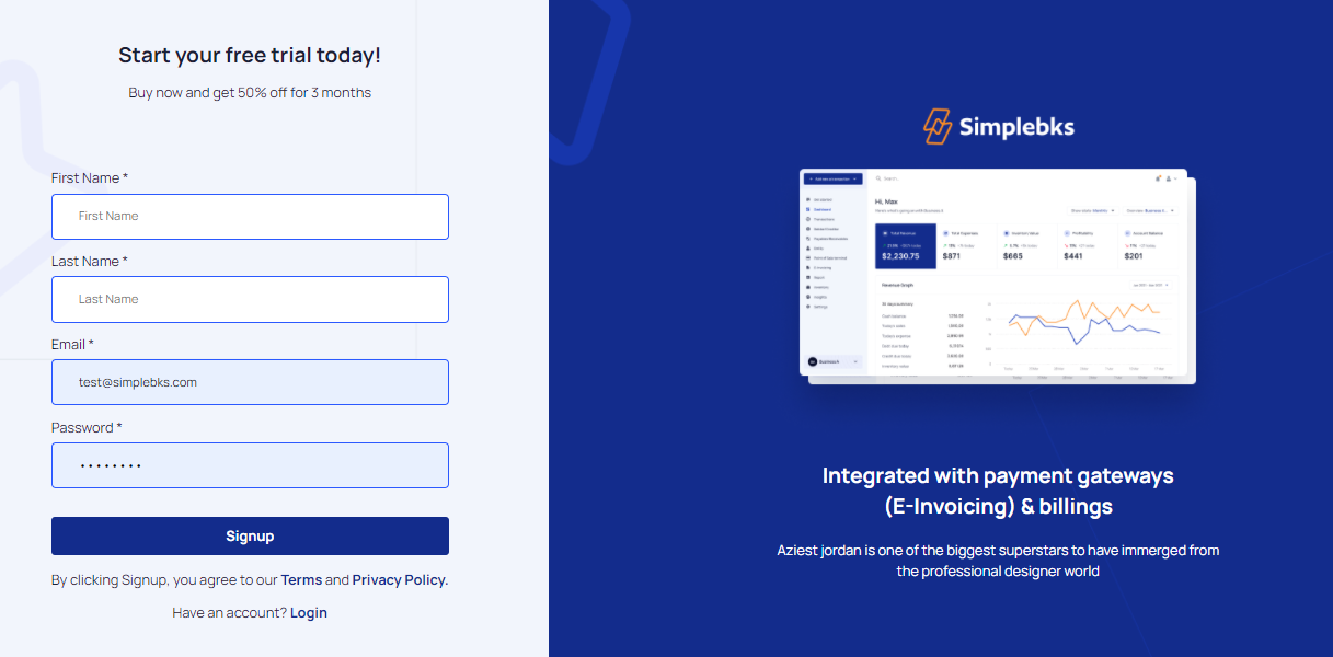 1. Begin by visiting this link to provide your Full Name, Email Address, and Password for your account:https://app.simplebks.com/sign-up