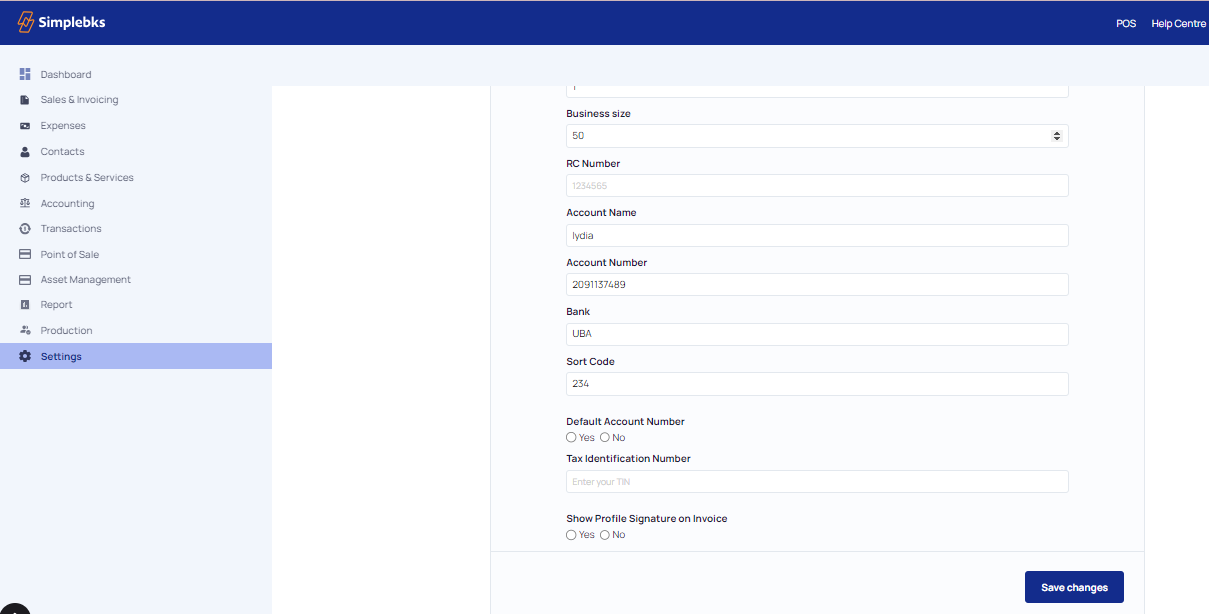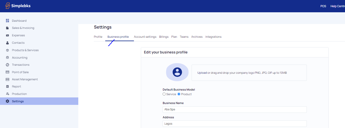 b. Business Name: Review or update your Company name. This is what will be displayed in all your business reports and Invoices.