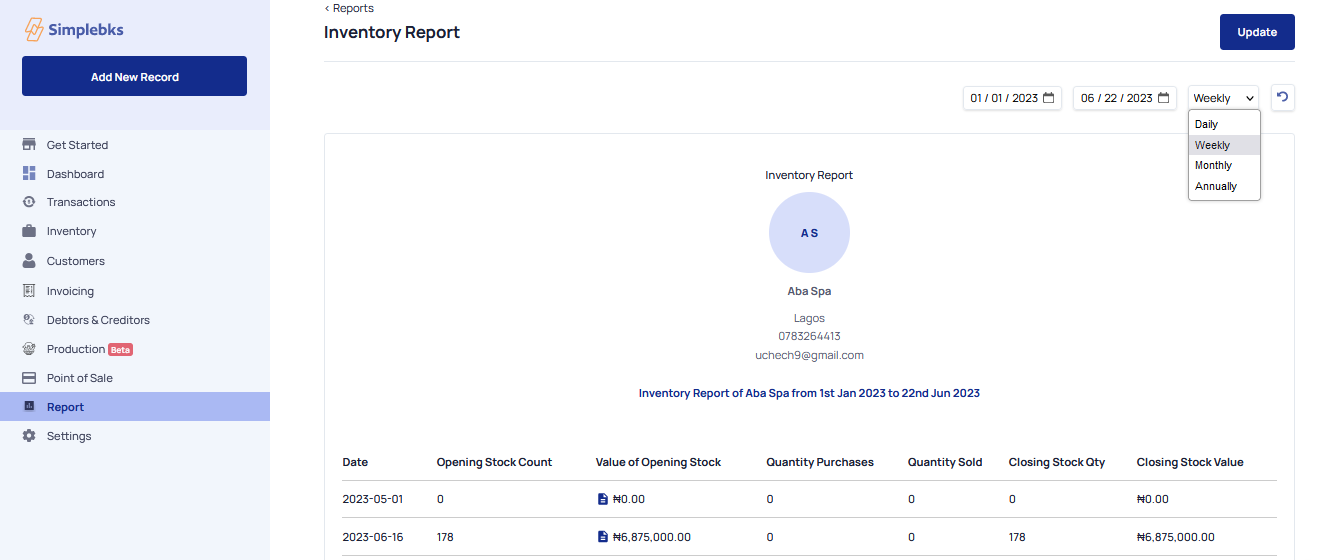 Go to FILTER> From the drop-down click on Weekly to view the Weekly Inventory Report